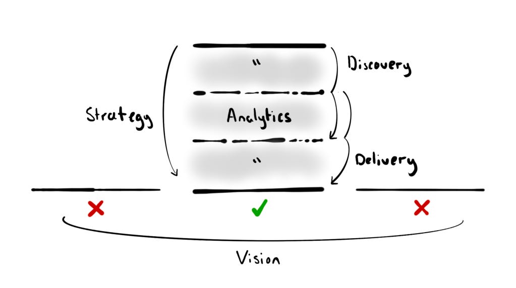 The relationships between the four canonical stages—original continuous, original discrete etc.—encompass product vision, strategy, discovery, delivery and analytics: